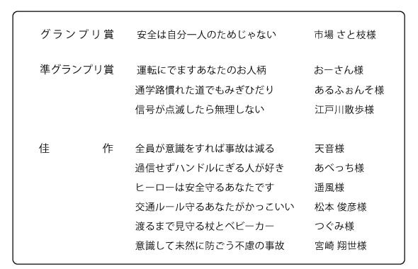 交通安全川柳コンテストにおきましては、総数617点ものご応募をいただき、誠にありがとうございました。
